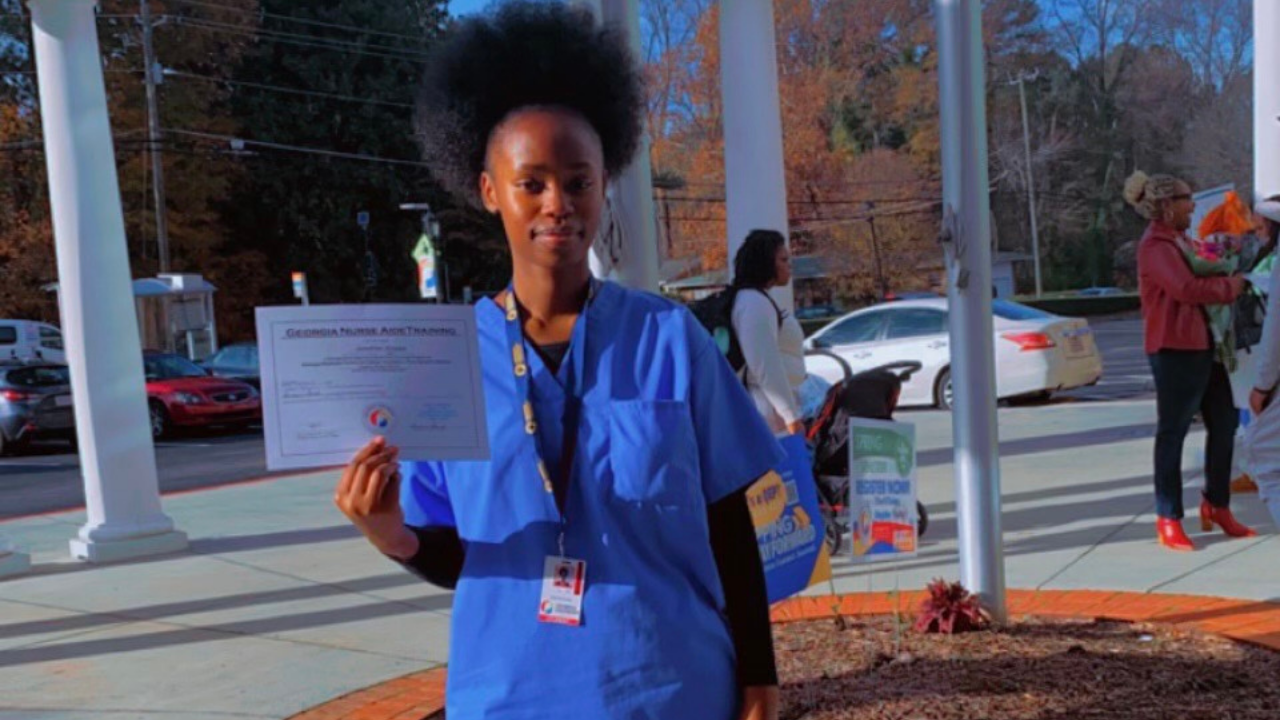 21-year-old Sandrine was first welcomed by the IRC in Atlanta in April 2022 after she and her family of seven, originally from Zambia, were resettled through the U.S. Refugee Admissions Program from the Democratic Republic of Congo. Talented, driven, and soon co-enrolled in the IRC’s Connect 2 Success and Career Development programs, Sandrine began working with Sam Camirand, Career Pathways Specialist, and Carlos McClaney, Youth Career Readiness Coach, in October 2022 and with their support, completed the Certified Nursing Assistant (CNA) training program at Georgia Piedmont Technical College (GPTC).