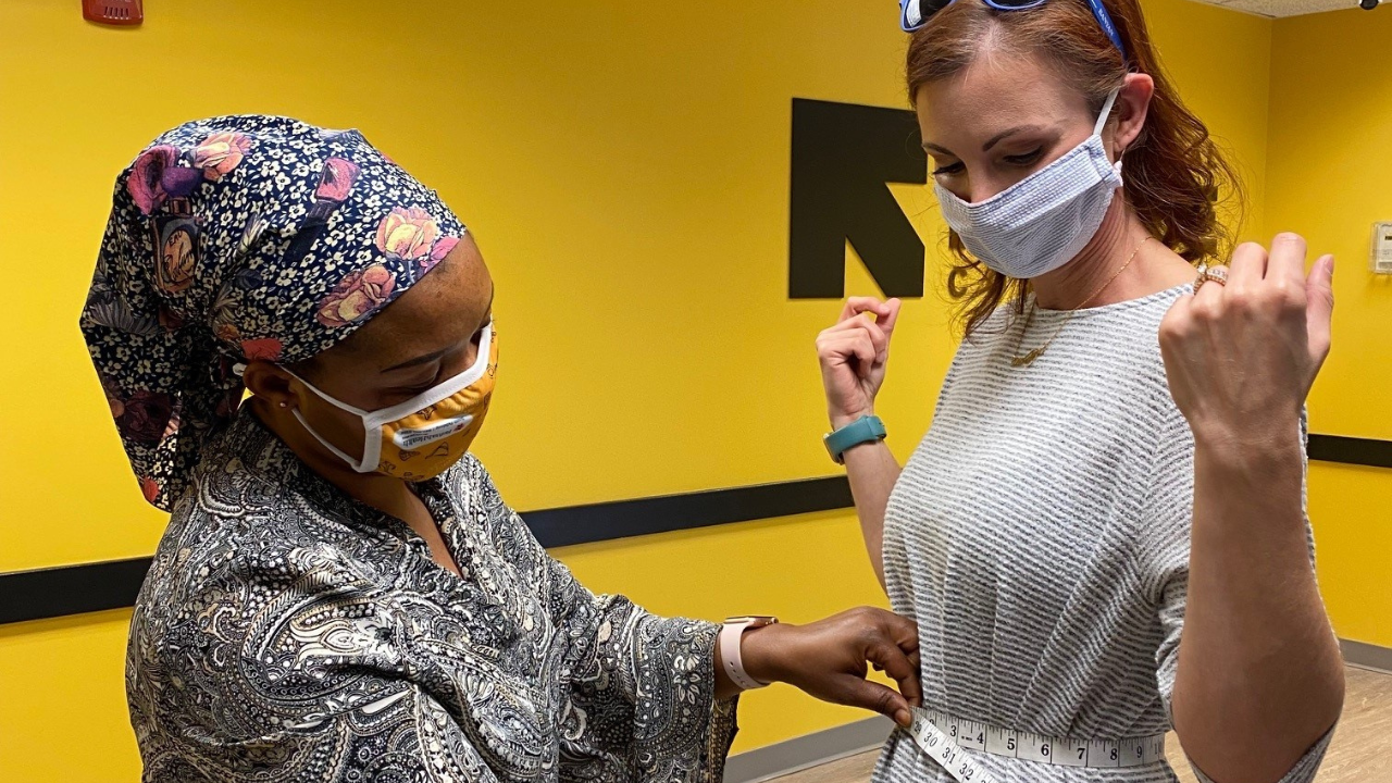 When asked about her favorite parts of being a business owner, she shared, “I love seeing people happy! Exchanging cultures is a part of being American, and I enjoy being a part of that exchange.” In Fall 2021, Olga was commissioned by IRC supporter and then Mrs. Georgia America, Darcy Castro, to design and create a stunning custom gown for her to wear at the Mrs. America pageant in Las Vegas. Over a series of fittings, Olga created a classic formal dress with a pop of traditional, colorful Congolese fabric and Darcy was thrilled with the final result. She found the unique gown to be an excellent conversation piece—especially around the importance of welcoming refugees—at the national event.