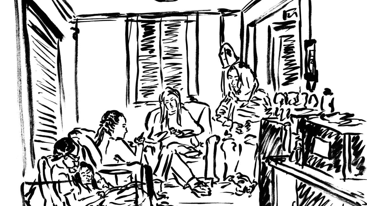 We started with a group of 12 to 16 people representing different organizations and we asked, ‘What can your organization help with?’ For example, one participant ran an ESL program at the local college and connected the families with the right classes. Another person from a Quaker organization whom was helping an Afghan family, eagerly took on cultural orientation and training modules to create presentations. A retired social worker jumped in to help with face-to-face discussions and guided the family through their new life. Artist Terrence Ho has captured the journey in these drawings to help share the story.