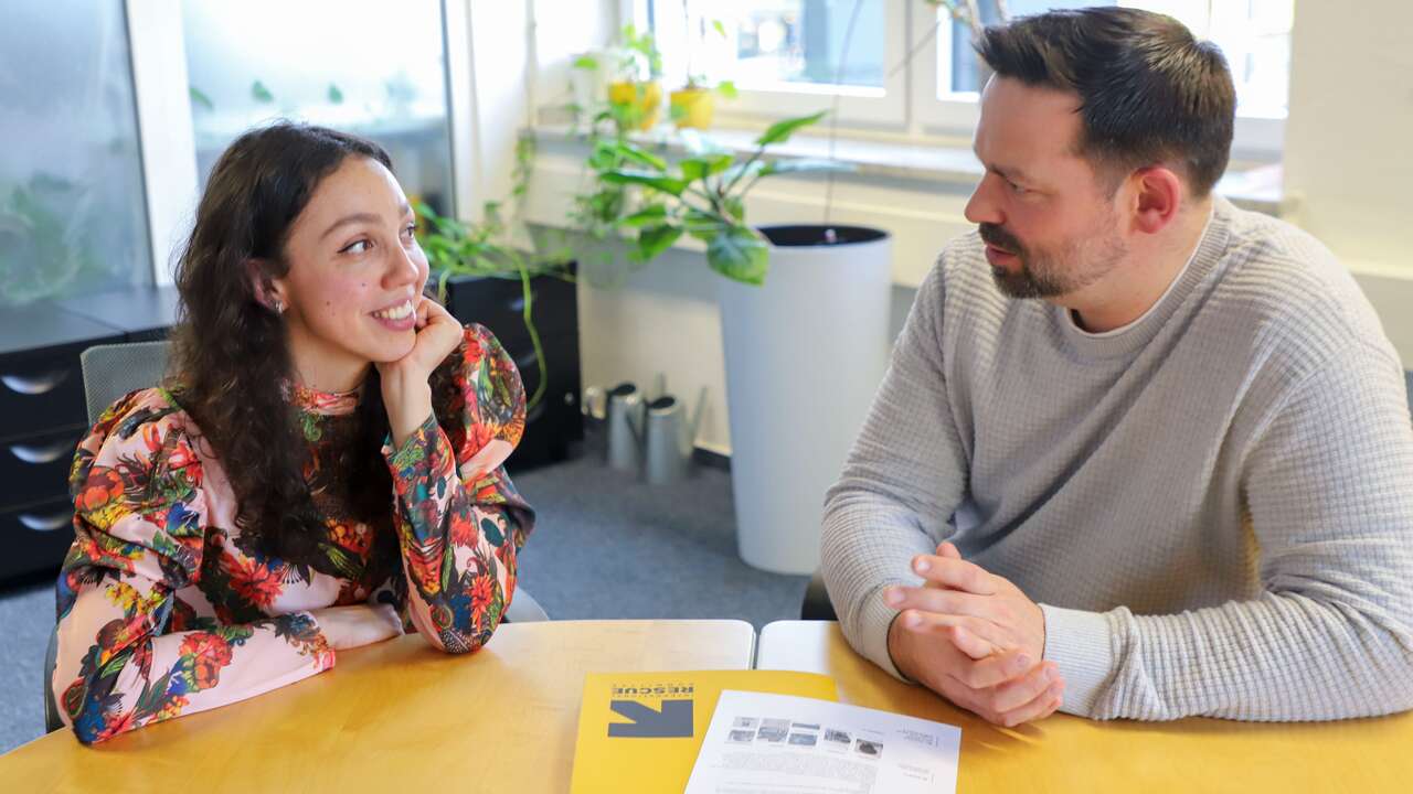 Ein Mann und eine Frau sitzen an einem Tisch in einem Büro, lächeln sich an und führen ein Gespräch.