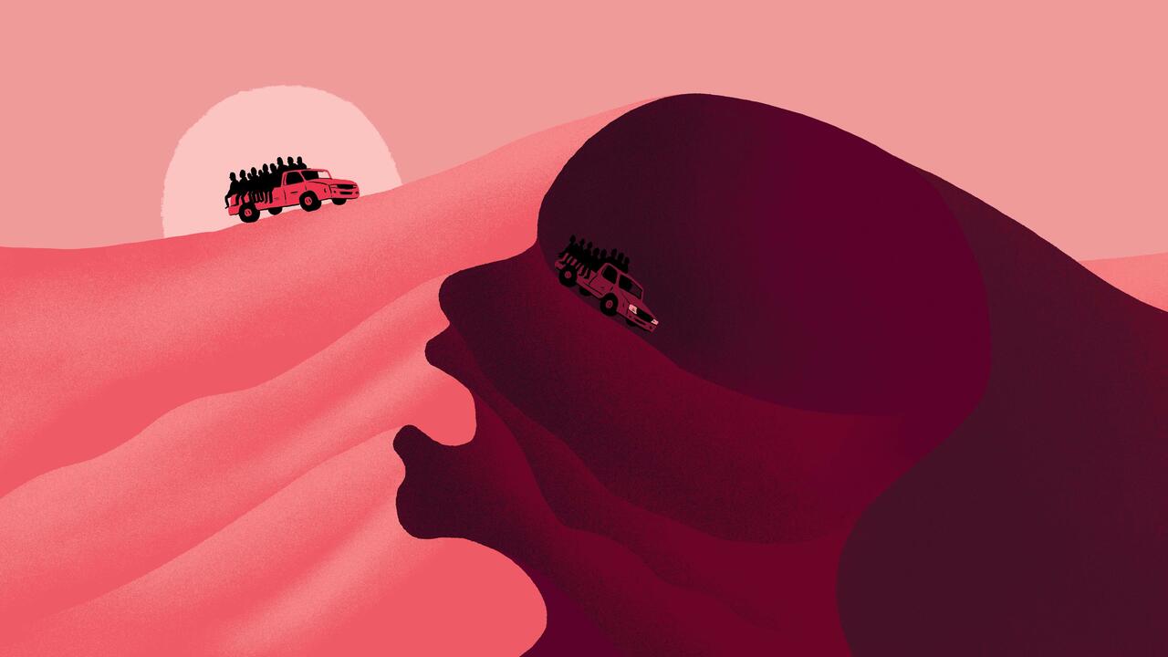 Der Weg nach Libyen führt durch die Sahara. Männer, Frauen und Kinder werden auf die Ladeflächen von Lastwagen gestapelt und aufgefordert, sich festzuhalten. Wer runterfällt, ist dem Risiko ausgesetzt, in der Wüste zurückgelassen zu werden.