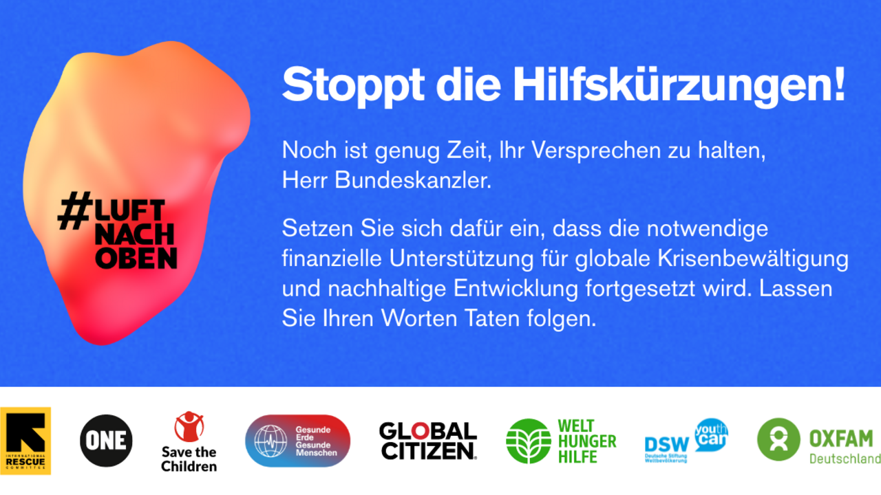 Um dieser Rolle gerecht zu werden und die 17 Ziele für nachhaltige Entwicklung (SDGs) der Agenda 2030 zu erreichen, müssen die finanziellen Mittel für Official Development Assistance (ODA) im Bundeshaushalt aufrechterhalten werden. Im Kontext einer koordinierten und gemeinsamen Anstrengung auf internationaler Ebene muss Deutschland weiterhin Verantwortung übernehmen und als verlässlicher Partner agieren. Wir fordern Sie auf, Ihr Versprechen für eine strategische und langfristige Finanzierung des humanitären Systems und für nachhaltige Entwicklung einzuhalten und, angesichts der globalen Herausforderungen, keine Kürzungen im Etat des Bundesministeriums für wirtschaftliche Zusammenarbeit und Entwicklung und der ODA-relevanten Ausgaben des Auswärtigen Amtes vorzunehmen.