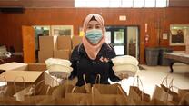 Die neunzehnjährige Rania Abou stammt aus Damaskus, Syrien. Heute verteilt sie im Auftrag von IRC und José Andrés' World Central Kitchen Lebensmittel in Elizabeth, New Jersey.