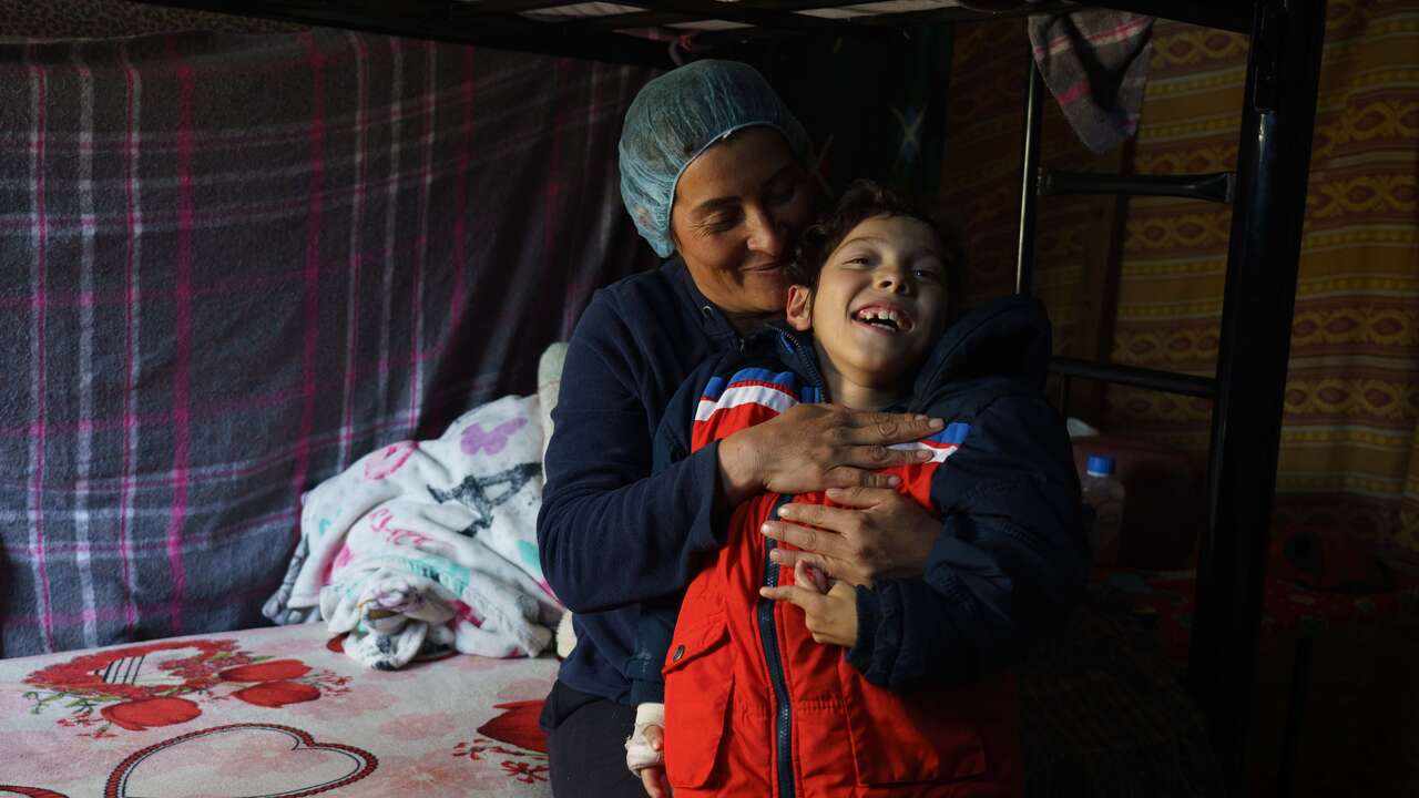 Sara holds her nine-year-old son, who has cerebral palsy, at a shelter in Ciudad Juárez.