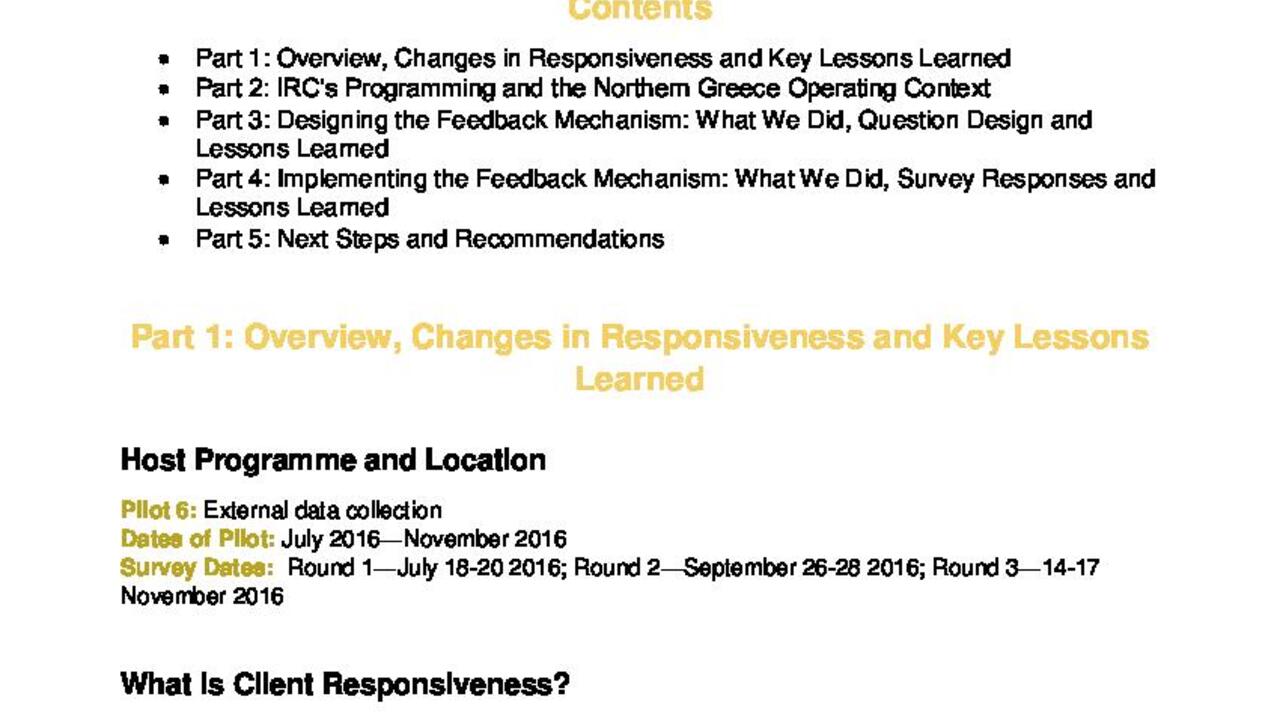 The International Rescue Committee's Client Voice and Choice initiative and Ground Truth Solutions are piloting an approach to better understand and strengthen how humanitarian assistance incorporates the preferences, aspirations, and expectations of the people at the focus of aid. This document details the methodology and findings of the pilot examining the Women’s Protection & Empowerment (WPE) and Water, Sanitation & Hygiene (WASH) services being delivered in camps serving refugees in northern Greece.