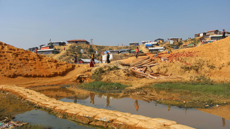 Refugees have built makeshift shelters from available materials, such as bamboo and tarpaulin, which will not stand up to lashing rain and heavy wind. The new arrivals had no choice but to strip the land of vegetation, even roots, to use as fuel, making the ground susceptible to erosion and posing a serious risk of landslides on overcrowded hillsides.