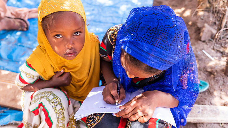 The IRC helps children whose families were displaced by conflict in Ethiopia and now live in Qoloji camp, in the south of the country, to continue their education. This work is supported with funds from the European Union. (Photo: Mekbib Tadesse/IRC)
